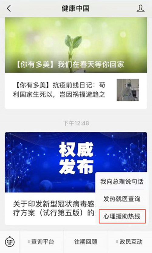 人民网北京2月5日电(王国菁)5日,健康中国在微信公众号发文称,为了在疫情期间帮助大家预防与减轻疫情所致的心理困顿,方便公众及时得到心理援助服务,健康中国政务新媒体平台联合国务院客户端推出了“全国心理援助热线查询服务”。