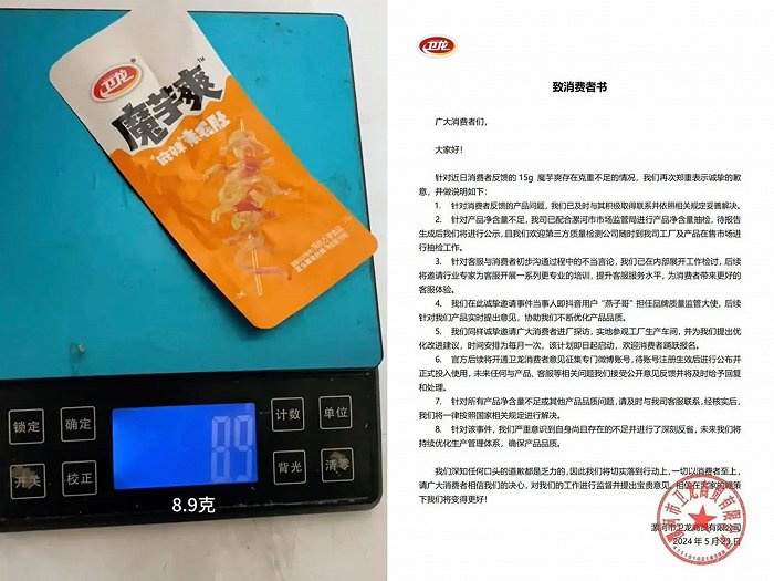 消费者测量卫龙产品重量(左图)卫龙发布道歉(右图)
