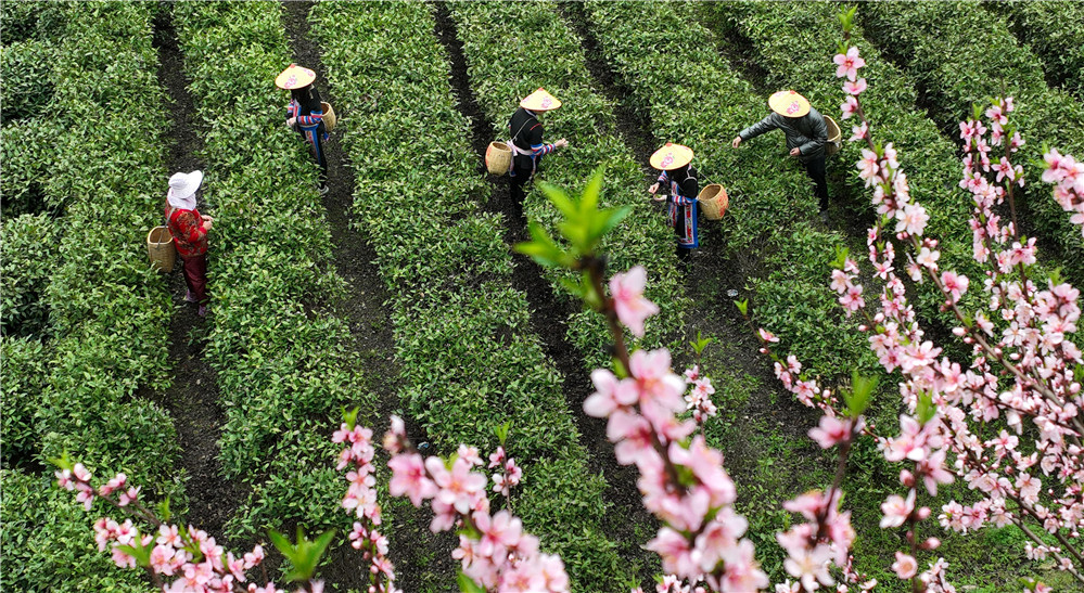 3月20日,在湖南衡阳常宁市塔山瑶族乡,茶农在茶园采茶(无人机照片)。