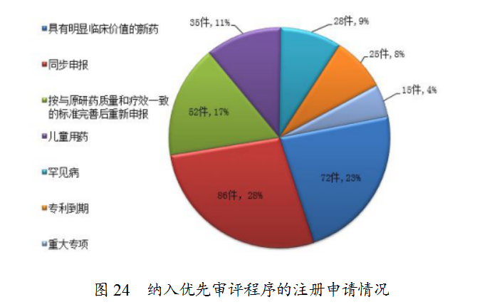 根据国家食品药品监督管理总局(以下简称原总局)《关于鼓励药品创新实行优先审评审批的意见》(食药监药化管〔2017〕126号),2018年,药审中心共将313件注册申请纳入优先审评程序,其中儿童用药和罕见病用药63件。2018年纳入优先审评的注册申请中,同步申报的品种占比最大,占比为28%,其次为具有明显临床价值的新药,占比为23%。纳入优先审评程序的注册申请情况详见图24。