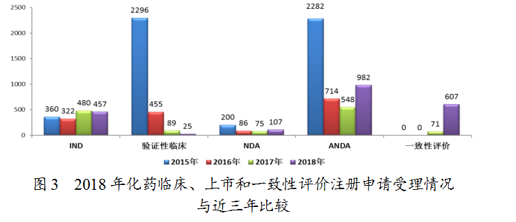 2018年,药审中心受理的7336件新注册申请中,化药注册申请受理量为5979件,占2018年全部注册申请受理量的82%,2018年各类药品注册申请受理情况与近三年比较详见图1。
